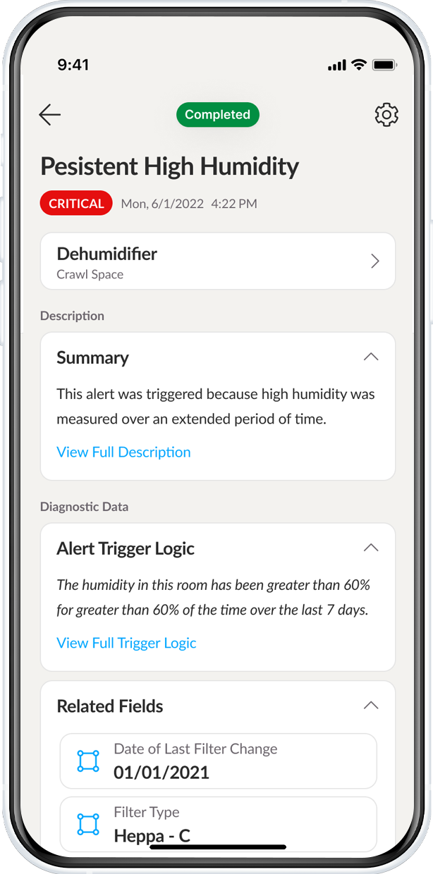 View a list of historical events for your appliance. Tap into each event to see diagnostic data and details about each event.