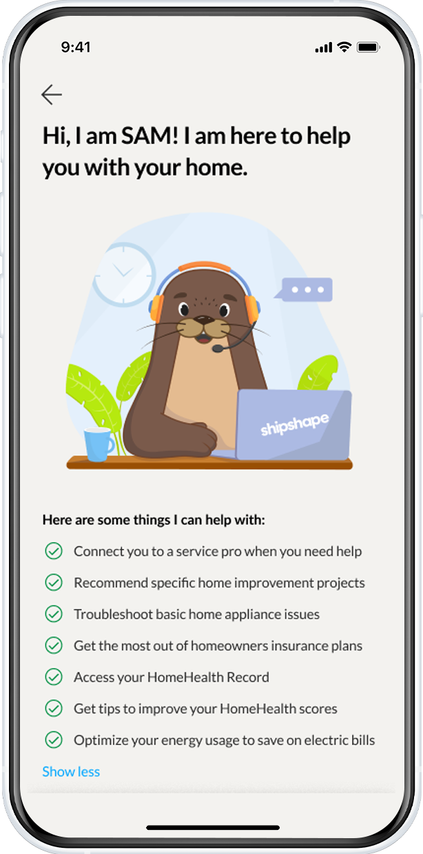 SAM provides the best possible solution by reviewing all the information and data about your home in the Shipshape app. You can ask SAM about app features, home projects, finding qualified pros, reviewing quotes and more!